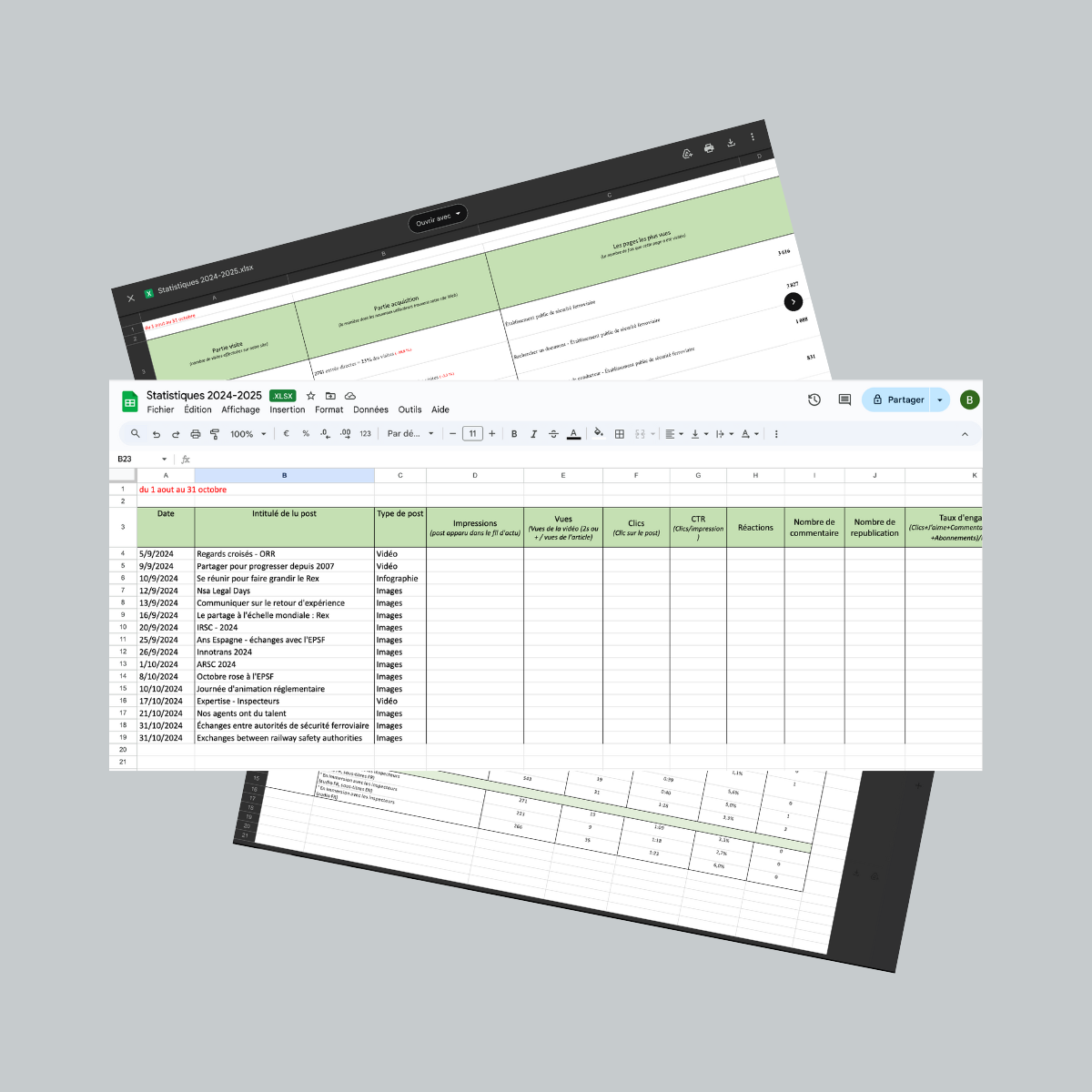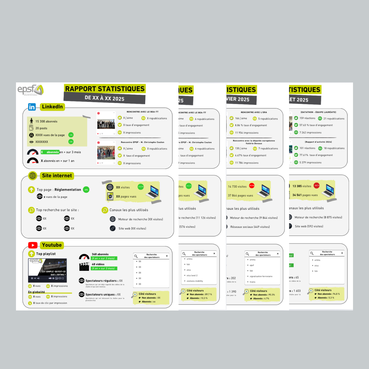 Ce rapport trimestriel permettait d’avoir une vision d’ensemble de notre présence en ligne, en mettant en évidence les contenus les plus performants, l’évolution de notre communauté, l’engagement des utilisateurs, ainsi que les points à améliorer.