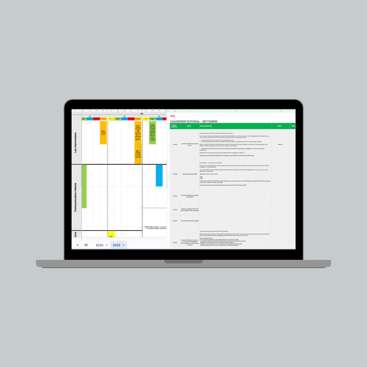 Je pilotais également l’élaboration et la gestion du calendrier éditorial, véritable outil de planification stratégique permettant d’anticiper et d’aligner les contenus.